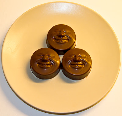 Sen var det bara att fylla upp formarna med mer choklad. Jag bankade formen lite i diskbänken för att få ut luftbubblorna, sen in i kylen med dem.